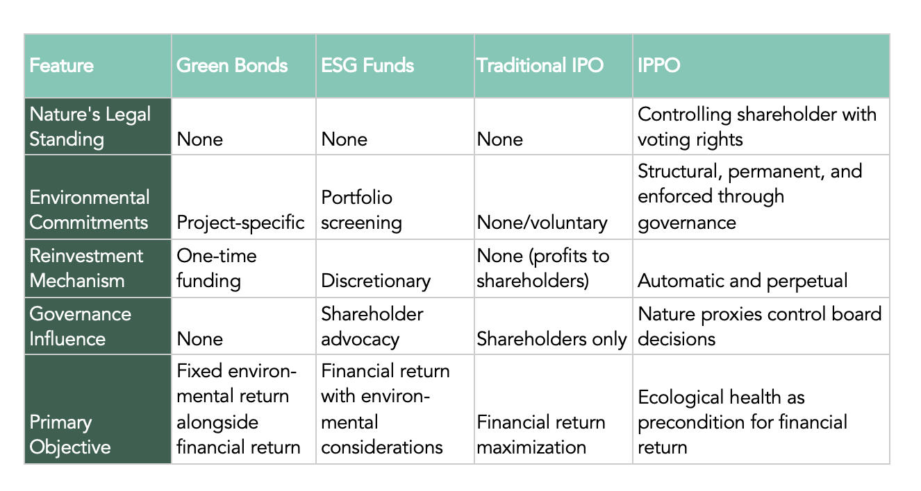 While Natural Asset Companies propose monetizing ecosystem services, IPPOs address governance: nature doesn’t just need better valuation, it needs decision-making power. Can we create financial structures where nature’s health and investor returns are mutually reinforcing—not in theory, but by design? The full whitepaper—including detailed legal structures, governance mechanisms, risk analysis, and implementation roadmap—will be available soon.